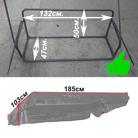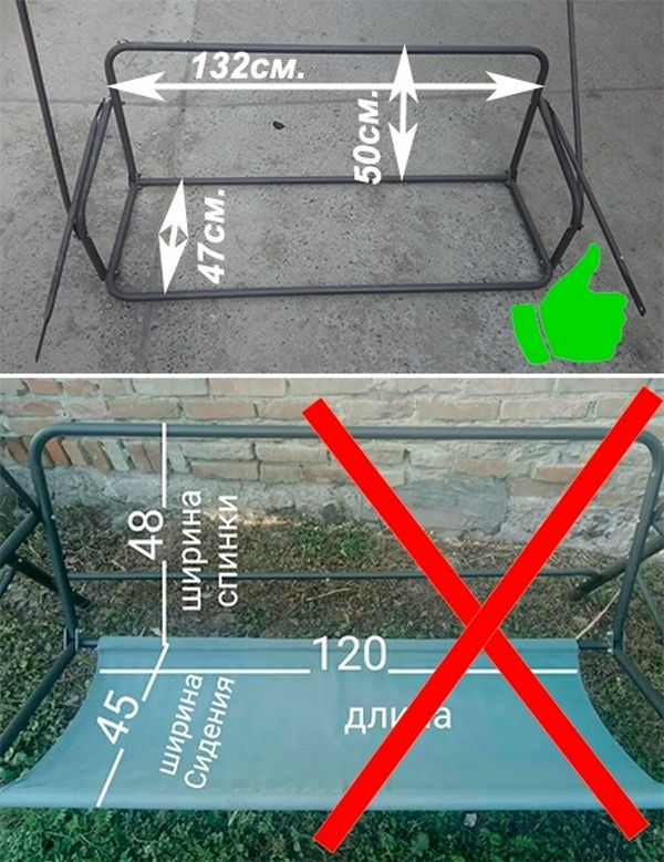 Увага!!! Міряти потрібно не саму тканину, а металевий каркас по зовні, як показано нижче на фото. Якщо ви не впевнені в своїх замірах, надішліть нам свою стару тканину (доставку оплачуєте ви), або скиньте фото гойдалки на Viber +38 (096) 021-82-22 щоб ми підказали як правильно зробити заміри.